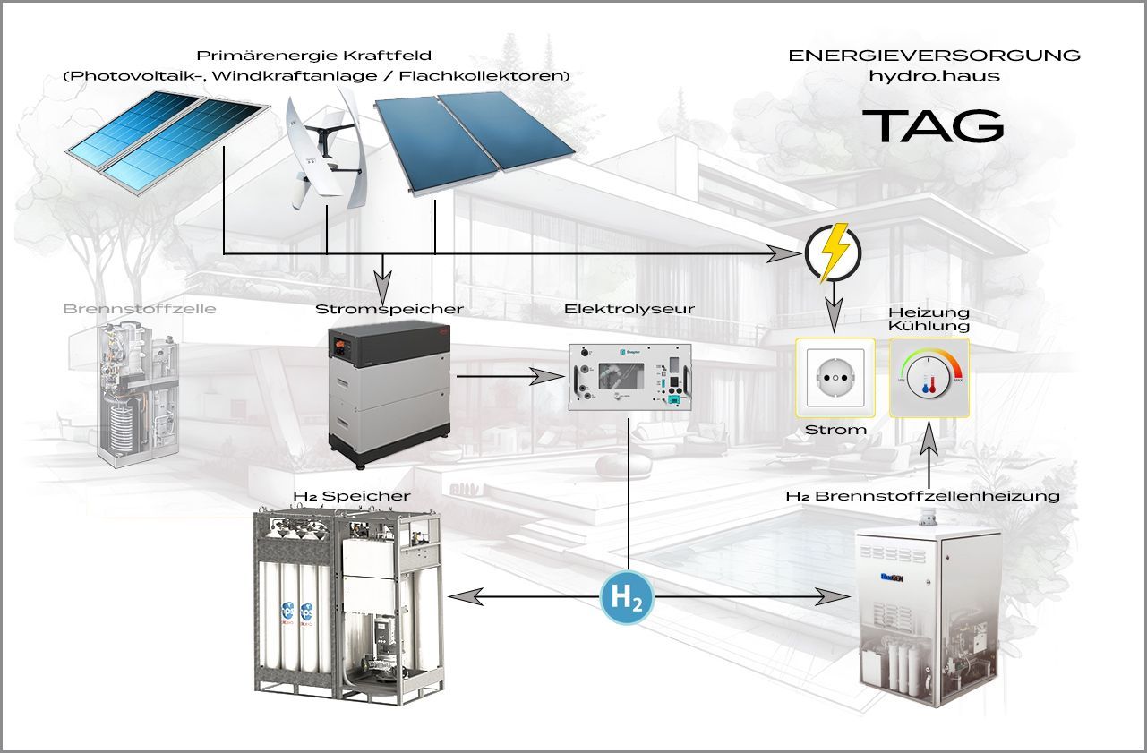 FUNKTIONSPRINZIP Das intelligente Energie-Managementsystem des autark konzipierten hydro.hauses nutzt erneuerbaren Strom aus dem umfassenden Primärenergie Kraftfeld (Photovoltaik, Windkraft, Kollektoren), um überwacht gesteuert aus aufbereitetem Regenwasser erzeugtes Wasserstoff (H2) zu speichern und daraus für den eigenen Bedarf immer genügend Stromenergie zu generieren. Kurz: Abgasfreie Energie aus reinem Wasser! Das hydro.haus ist damit deutschlandweit das erste energieautarke emmissionsfreie Energieeffizienzhaus. Es verzichtet durch eine eigene Stromerzeugung und regenerativen Heizsystemen wie Solarthermie, Infrarot-/H2-Heizung und Warmwasserspeicher nachhaltig auf herkömmliche Wärmepumpen und den dafür zusätzlich notwendigen fossilen Brennstoffen.