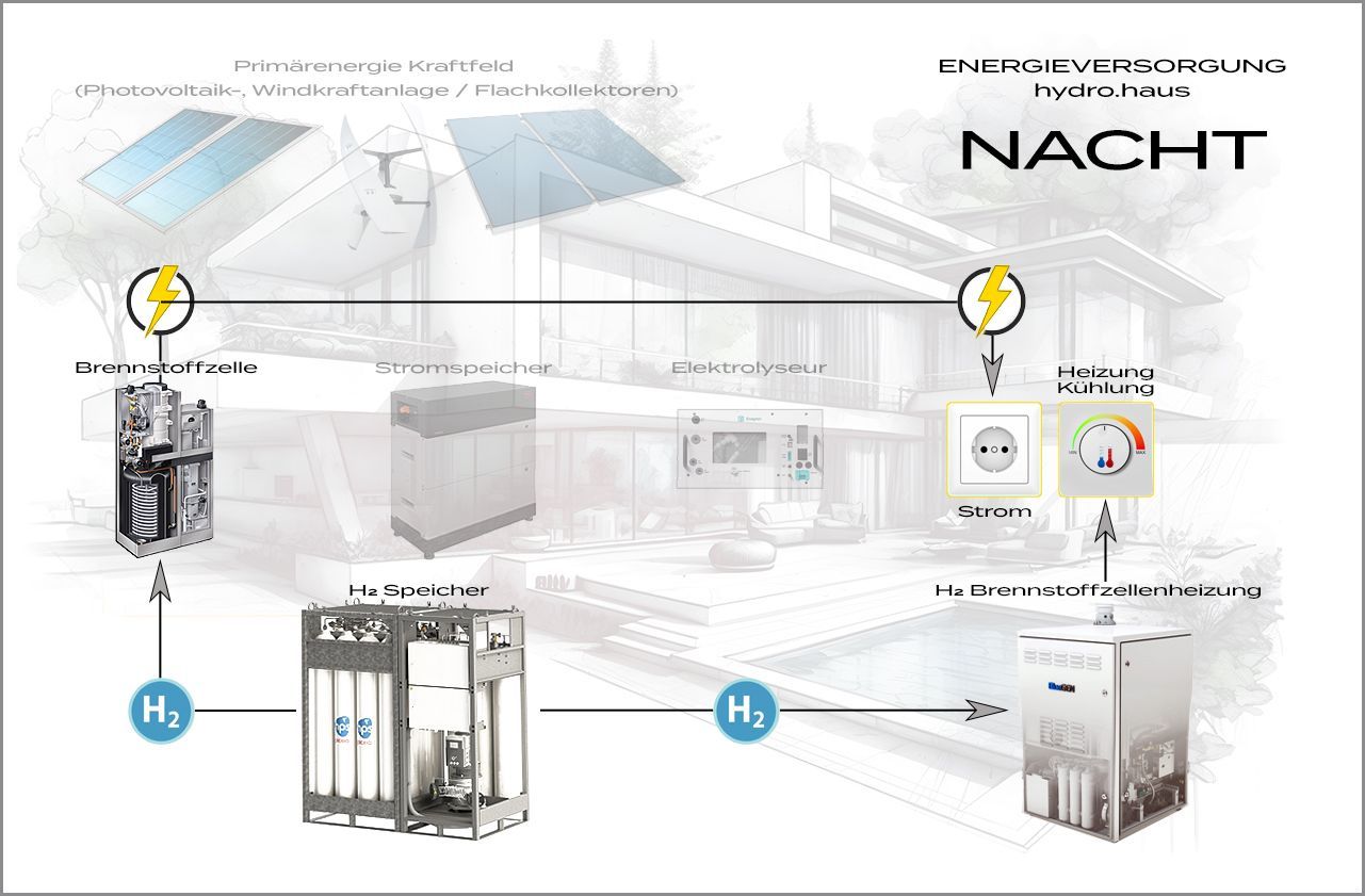 FUNKTIONSPRINZIP Das intelligente Energie-Managementsystem des autark konzipierten hydro.hauses nutzt erneuerbaren Strom aus dem umfassenden Primärenergie Kraftfeld (Photovoltaik, Windkraft, Kollektoren), um überwacht gesteuert aus aufbereitetem Regenwasser erzeugtes Wasserstoff (H2) zu speichern und daraus für den eigenen Bedarf immer genügend Stromenergie zu generieren. Kurz: Abgasfreie Energie aus reinem Wasser! Das hydro.haus ist damit deutschlandweit das erste energieautarke emmissionsfreie Energieeffizienzhaus. Es verzichtet durch eine eigene Stromerzeugung und regenerativen Heizsystemen wie Solarthermie, Infrarot-/H2-Heizung und Warmwasserspeicher nachhaltig auf herkömmliche Wärmepumpen und den dafür zusätzlich notwendigen fossilen Brennstoffen.